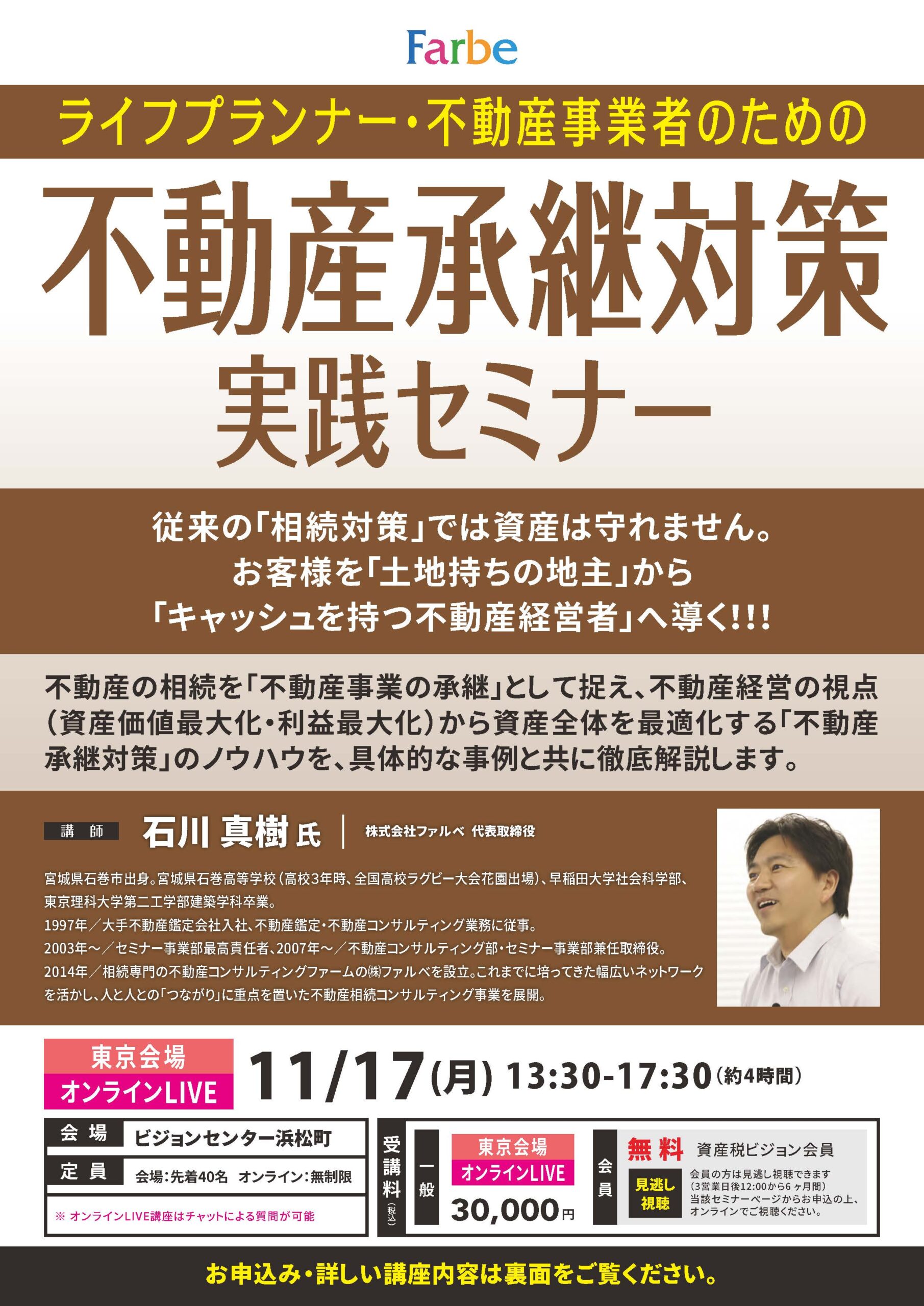 一般[会場受講]:30,000円(税込) 一般[オンラインLIVE受講]:30,000円(税込) 資産税ビジョン 会員: 無料 |