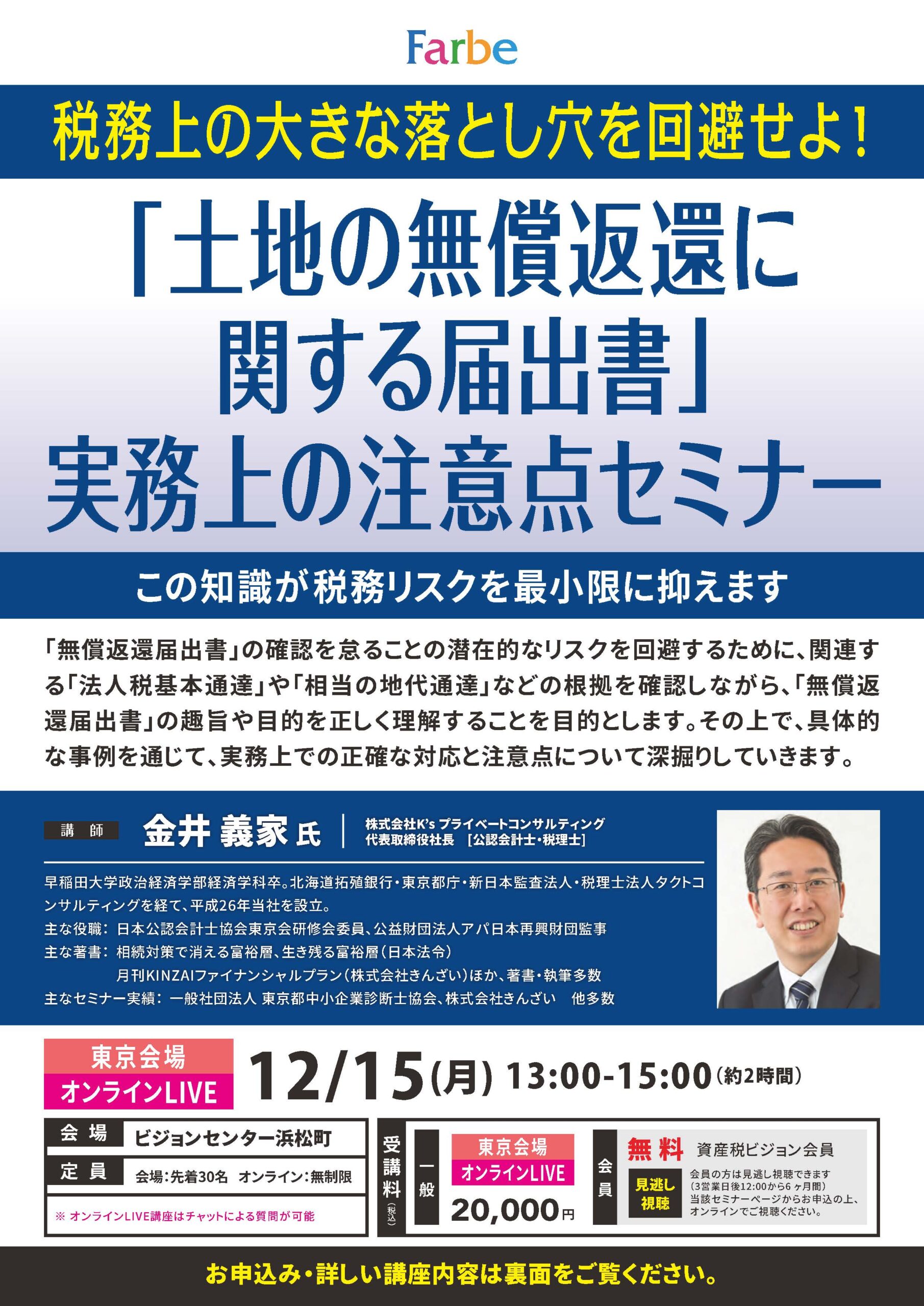 一般[会場受講]:20,000円(税込) 一般[オンラインLIVE受講]:20,000円(税込) 資産税ビジョン 会員: 無料 |