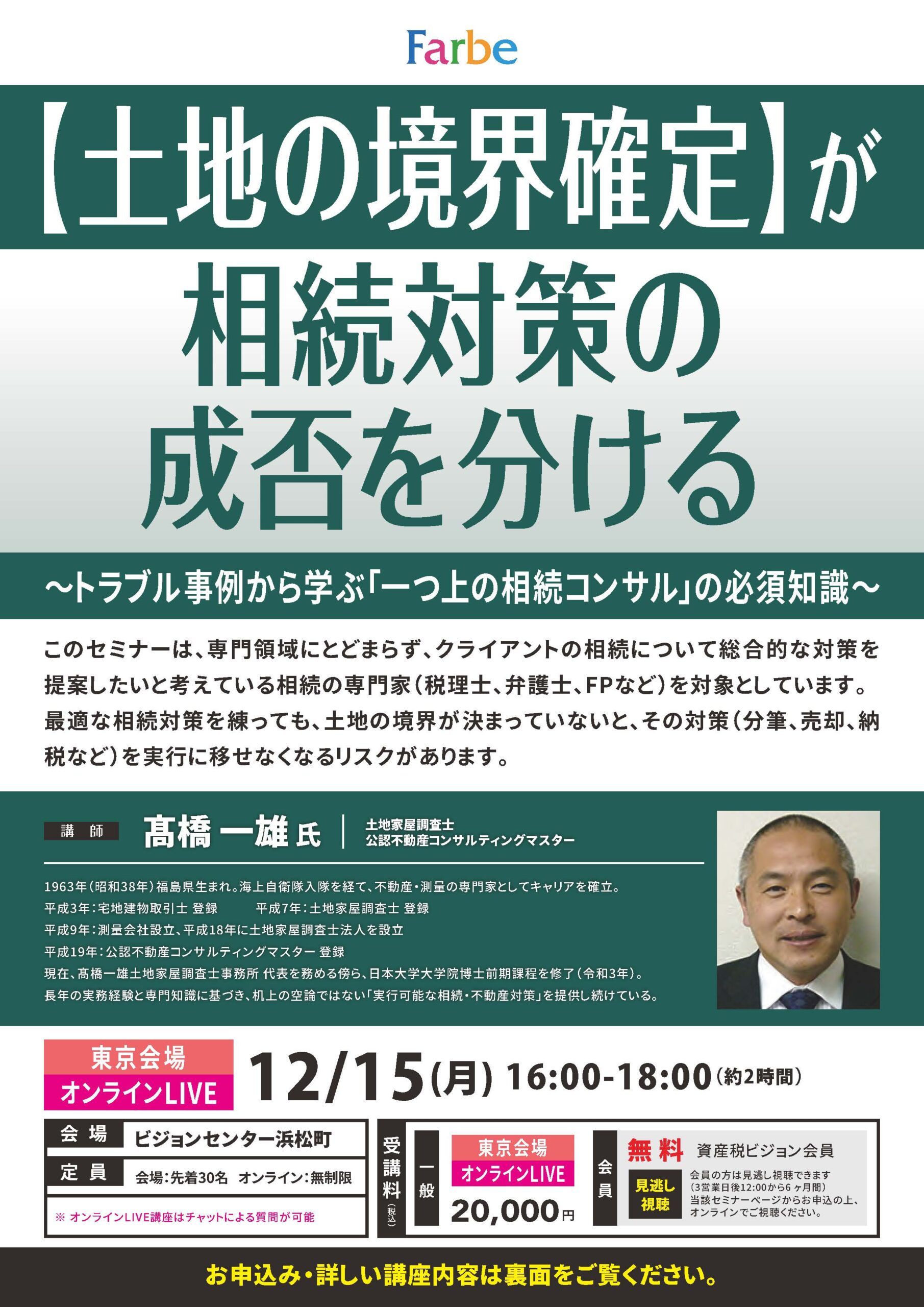 本セミナーでは、境界確定と相続の関係について、実際に起こったトラブル事例を中心に、対策を「絵に描いた餅にしないため」の具体的な知識を解説します。