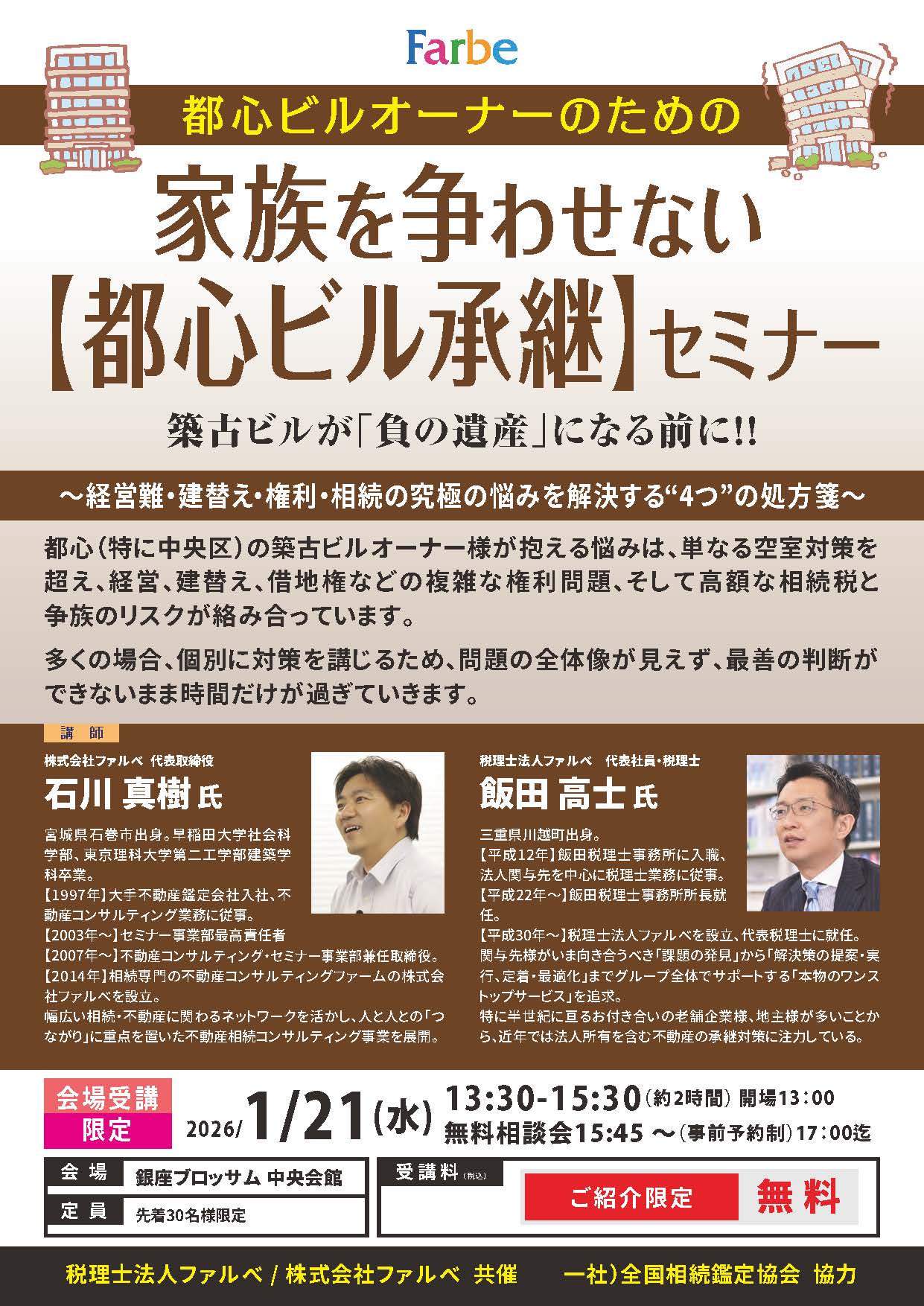 | 開催日時 | [生講座] 2026年1月21日(火) 13:30~15:00(約2時間)開場13:00 無料相談会 15:45~17:00(事前予約制) |