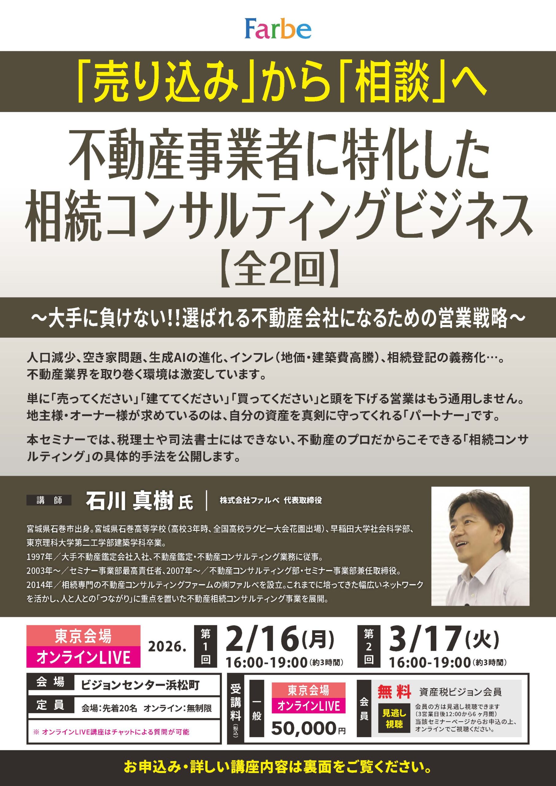 一般[会場受講]:【第1・2講座一括】50,000円(税込) 一般[オンラインLIVE受講]:【第1・2講座一括】50,000円(税込) 資産税ビジョン 会員: 無料 |