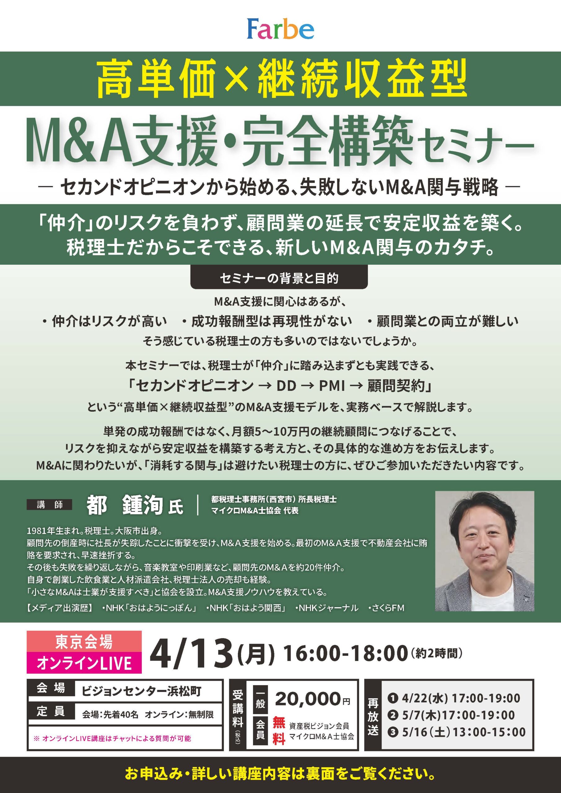 M&Aに関わりたいが、「消耗する関与」は避けたい税理士の方に、ぜひご参加いただきたい内容です。